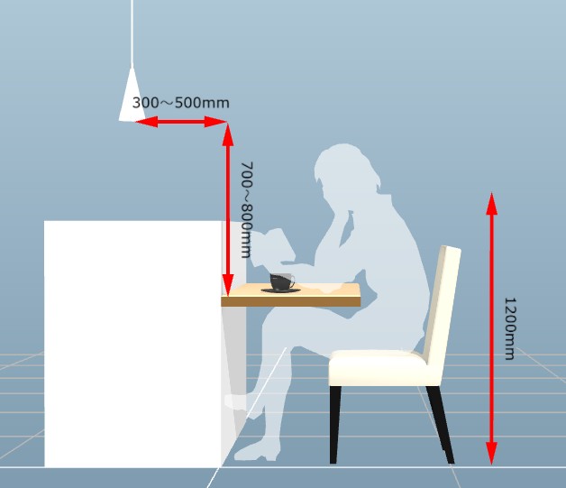 カウンター席では、カウンター面から30~50cm前方に照明器具を配灯することで、顔に影ができず、かつ手元が明るい理想的な配置となります。ペンダント照明を使う場合は、テーブル面から70~80cmの高さに吊り下げることで、眩しさを抑えつつ、適切な照度を確保できます。