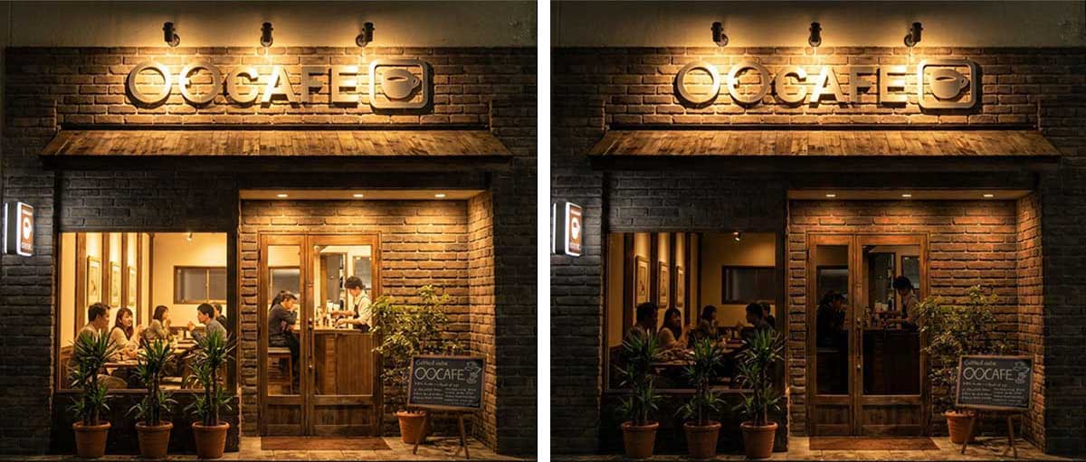 レンガ壁やアイアン素材を使ったヴィンテージ系カフェでは、2400~2700ケルビンで温かく演出します。