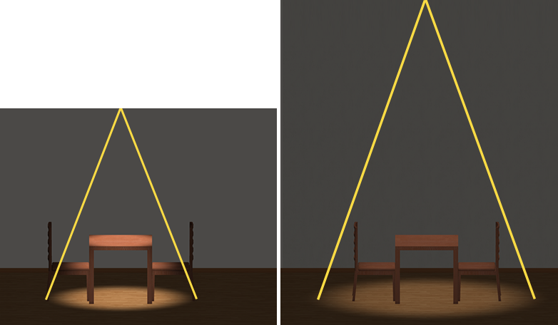 同じ照明器具でも設置高さ(天井の高さ)によって範囲と明るさが異なる