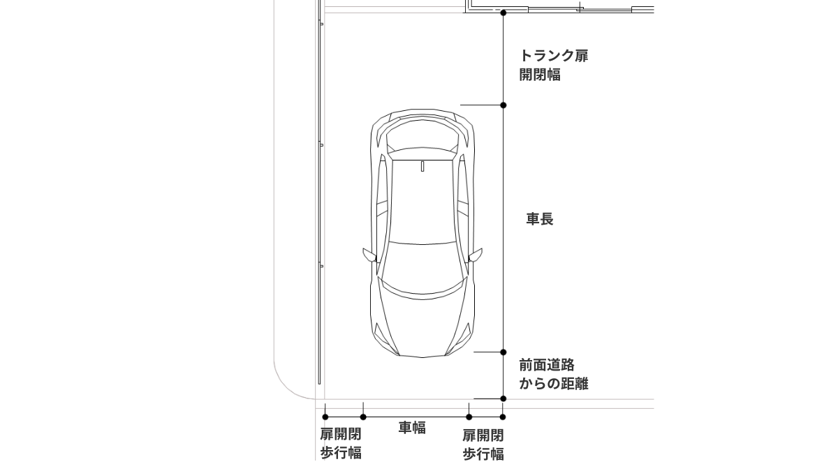 奥行き:車長+前面道路からの距離+車のトランクドア開閉幅