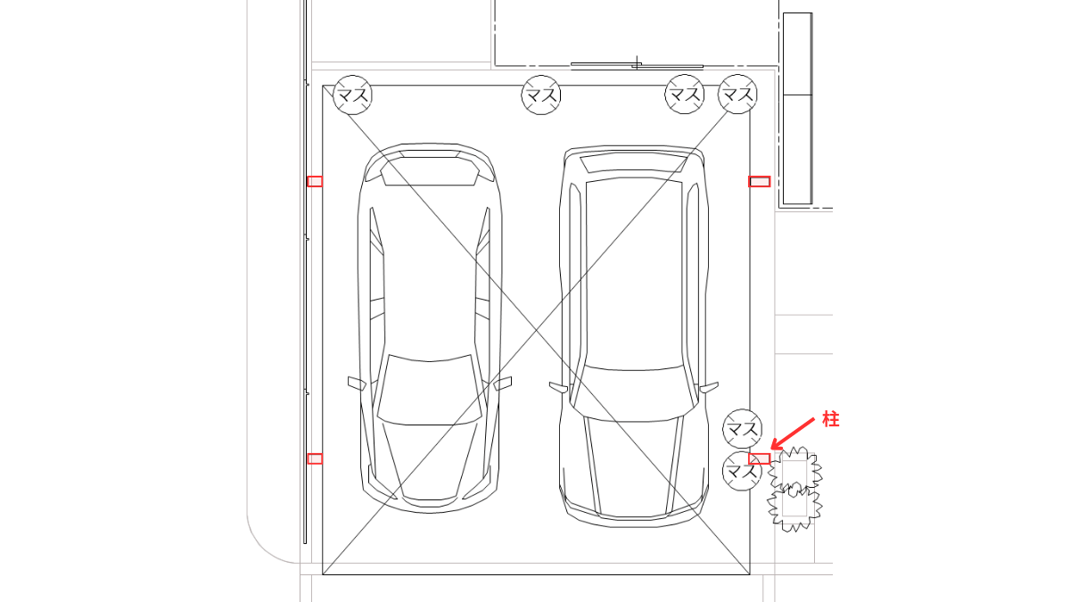 これは、実際の車のサイズを確保していたつもりだったのに、事前の想定不足が原因で必要な面積が確保できなくなってしまったという例になります。