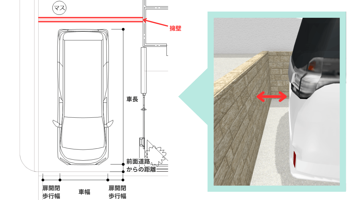 また、できればぜひ一度図面上だけでなく、スケールなどを使って車のサイズと歩行する幅がどのくらい必要かというのを体感してみていただくと、数字だけで考えているよりも現実的にイメージができてわかりやすいと思います。