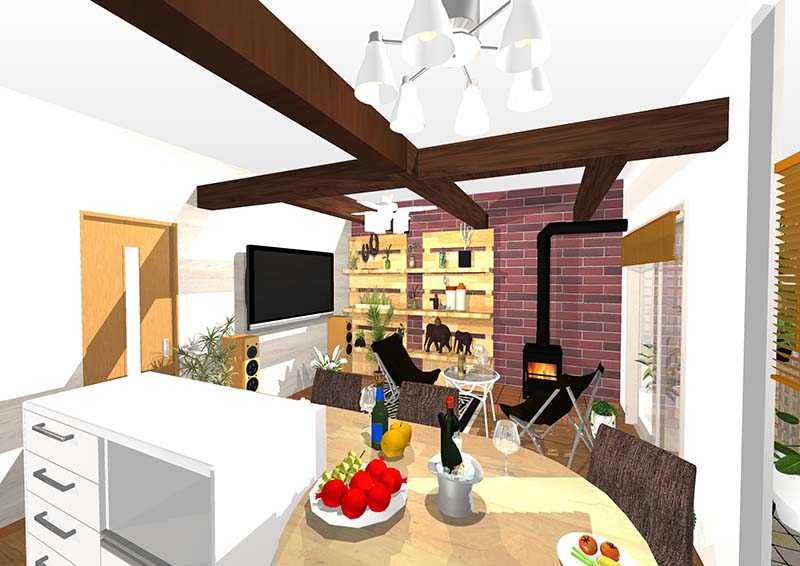 室内にいながら、ログハウスのような暖炉や木の雰囲気が味わえて、夜や冬の家が一層楽しくなりそう。