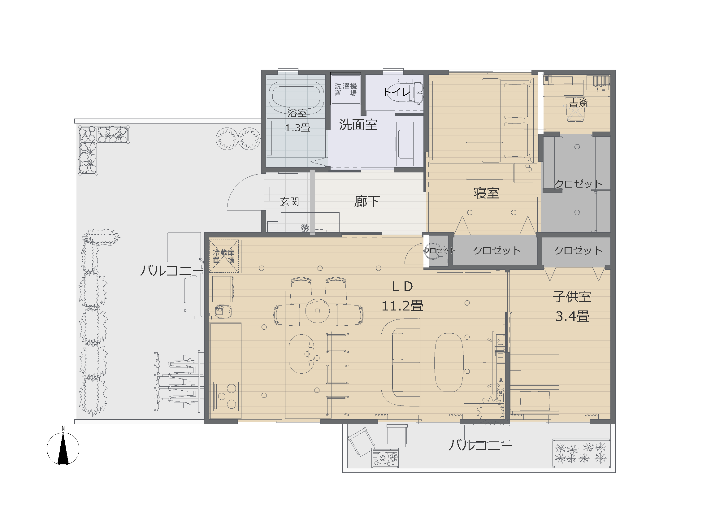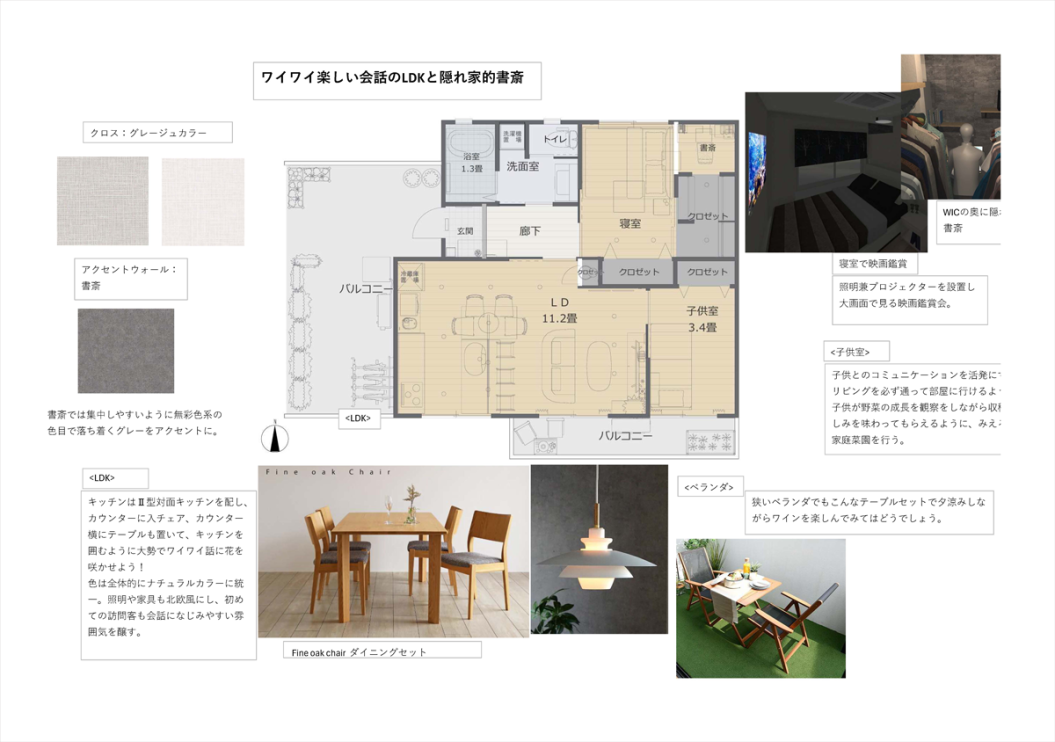 | プランの解説文 | 子供部屋はリビングを通る位置にして、子供とのコミュニケーションを大事にしながらリビング学習でサポート。また、子供部屋からは毎日家庭菜園の観察をしながら野菜の成長と収穫を楽しむ。 キッチン周りに大勢が集まっておしゃべりに花が咲くように座る場所が一杯。 ベランダに出て夫婦で夜景を観ながらワインタイム。 寝室では照明を兼ねたプロジェクターを設置して家族で大画面の映画などを鑑賞できます。 寝室の奥には家具を持たない代わりに大きなクローゼットの別にウォークインクローゼットでシーズンオフの衣装を管理。 また、WICを通り抜けると隠れ家的な書斎が。 |