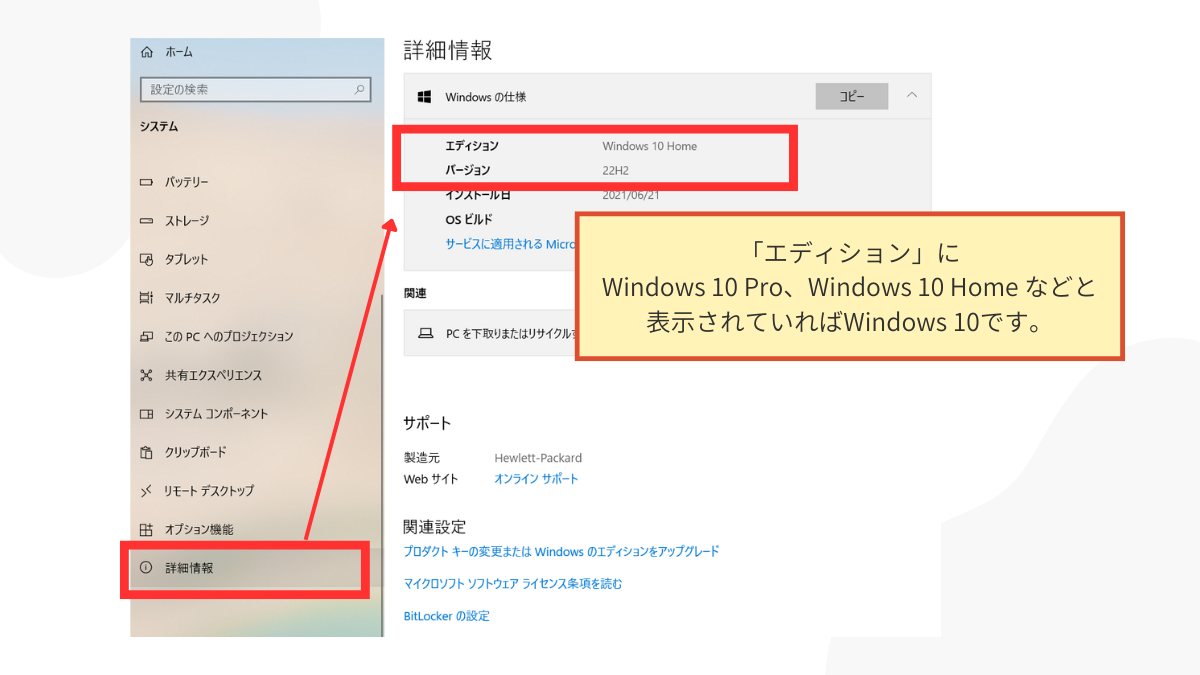 エディションに「Windows 10 Pro」「Windows 10 Home」などと表示されていればお使いのパソコンは「Windows 10」です。サポート終了日(2025年10月14日)までにアップグレード計画を立てましょう。