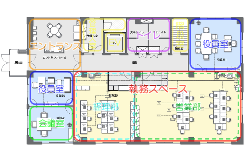 オフィスレイアウトとは、オフィス空間の中で、部門や各種機能スペース、動線など大まかなスペースを決めるゾーニング計画の後に、オフィス家具や間仕切り、備品の配置を計画すること。