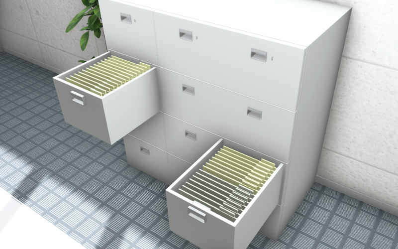 文書の作成中からファイリングでき、分類の変更や細分化がしやすい。また、引き出しに鍵をかけることでセキュリティの確保もしやすい。反面、引き出しに収納するため目の高さより上には保管ができず、オフィスを縦方向に活用できない。